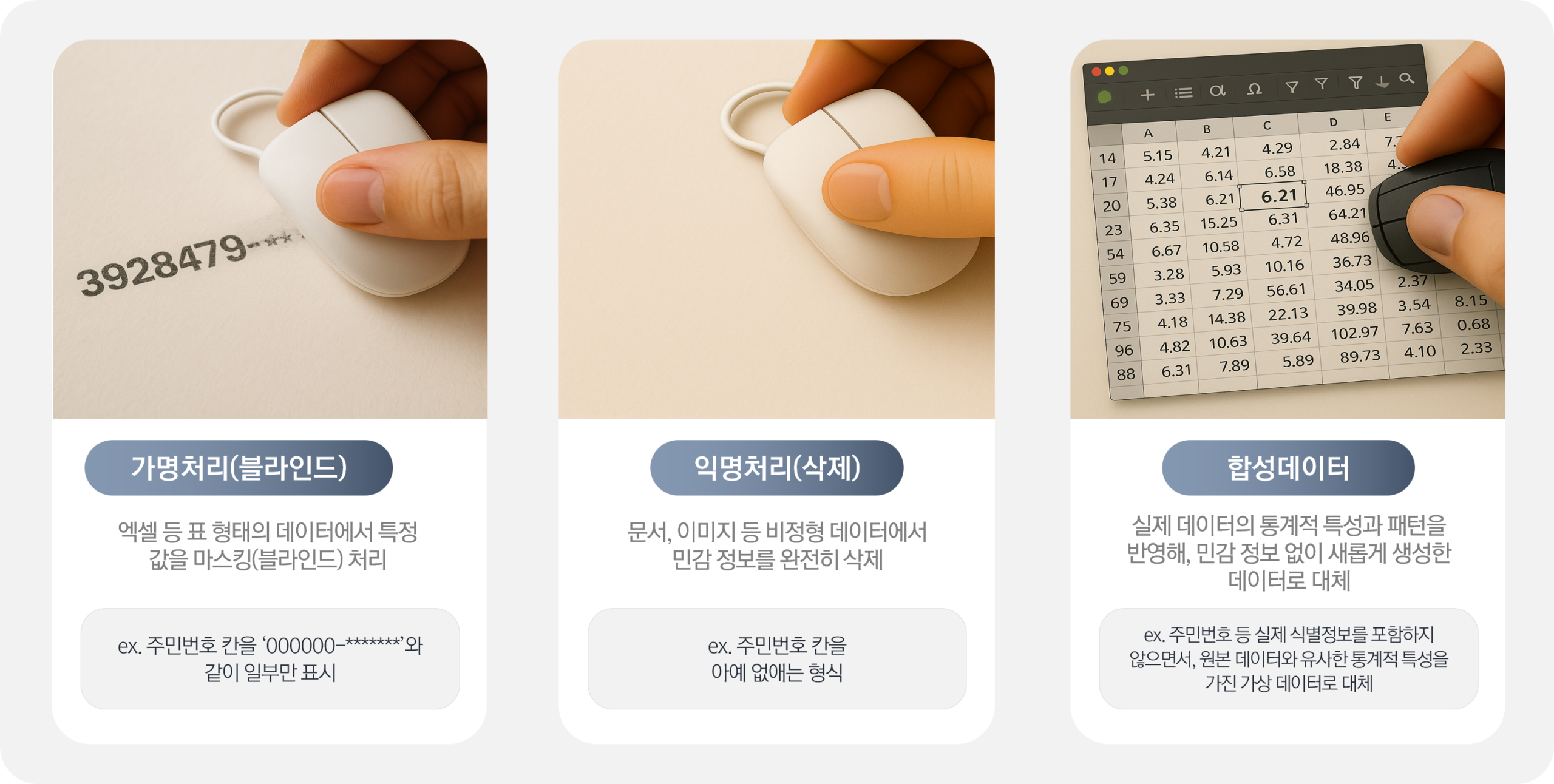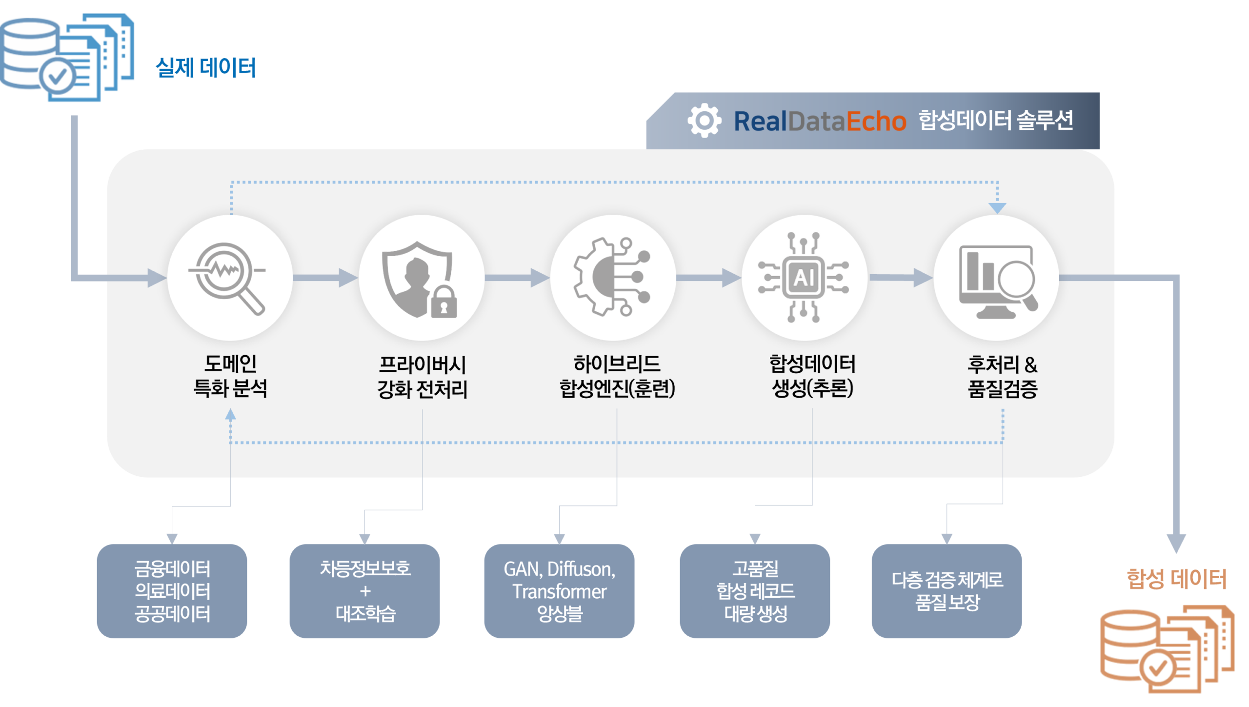 Synthetic Data 합성 데이터 홈 · 합성데이터 Synthetic Data “합성 데이터는, 실제처럼 보이지만 실제는 아닌 AI가 만든 데이터입니다.” 개인정보 걱정 없이 실제 데이터처럼 쓸 수 있는 합성데이터가 답입니다. Problem 고객의 고민 “데이터는 많은데, 왜 AI 개발이 이렇게 어려울까요?” 많은 기업이 AI로 성과를 내고 싶어하지만,막상 시작하면 예상치 못한 현실의 벽에 부딪힙니다. RealDataEcho 개인정보 걱정 없이 실제 데이터처럼 쓸 수 있는 합성데이터 솔루션해답은 RealDataEcho 입니다.“실제 데이터를 안전하게, 정교하게 다시 만든다”RealDataEcho는 도메인 분석부터 프라이버시 보호, 합성까지전 과정을 통합한 정형 데이터 특화 합성 솔루션입니다. 1️실제데이터“고객님의 소중한 데이터를 안전하게 받습니다”– 지원 형식: CSV, Excel, JSON, DB 연동– 보안 환경: 온프레미스 설치로 외부 유출 차단– 준비 시간: 단 몇 분이면 업로드 완료2️도메인 특화 분석“AI가 데이터의 숨겨진 패턴을 찾아냅니다”– 금융, 의료, 마케팅 등 분야별 전문 분석– 컬럼 간 상관관계 자동 파악– 시계열 패턴 및 계절성 인식3️프라이버시 강화 처리“개인정보를 완벽하게 보호합니다”– 차등정보보호(DP) 기술 적용– 민감 정보 자동 탐지 및 제거– 재식별 위험 0.01% 미만으로 제어4️하이브리드 합성엔진 (핵심)“3가지 최신 AI 기술의 조합”– GAN: 복잡한 데이터 분포 재현– Diffusion: 고품질 세부 패턴 생성– Transformer: 시계열 관계 보존5️합성데이터 생성 (후처리)“새로운 데이터가 탄생합니다”– 원본과 97% 동일한 통계적 특성– 개인정보는 0% 포함– 즉시 AI 학습 가능한 형태로 출력6️후처리 & 품질검증“엄격한 품질 관리를 거칩니다”– 통계적 유사성 자동 검증– AI 모델 성능 테스트– 개인정보 유출 위험 재점검7️합성데이터 (완성)“이제 걱정 없이 활용하세요”– 원본 대비 97% 품질 유지– 법적 위험 제로– 바로 AI 학습 및 분석 가능
