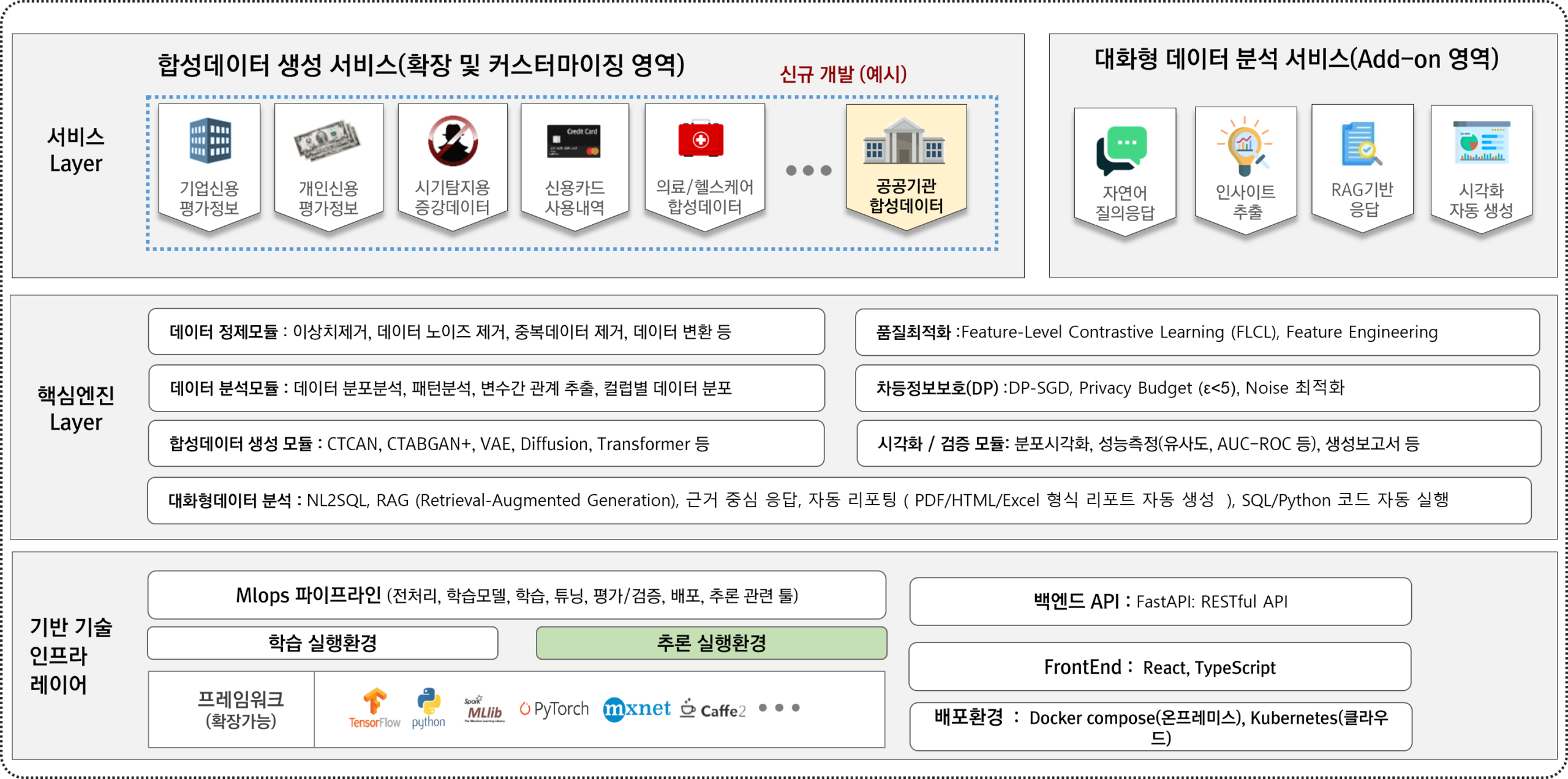 Solution 숫자로 증명된 성과 홈 · 솔루션 · 숫자로 증명된 성과 숫자로 증명된 성과 한국정보통신기술협회(TTA) 합성데이터 품질검증 결과 : – JSD: 0.003 / pMSE: 0.001 / CorrDiff: 0.036AI 학습용도로 적합한 통계 유사성, 분포 정합성 인증 → 금융 도메인 모델 학습용 데이터로 공개 승인AI Hub에 ‘금융 합성 데이터’로 공식 등재 : 누적 조회수: 24,000+ / 다운로드 수: 1,300+ SOLUTION RealDataEcho만의 특별함 특징 1: Privacy by Design 처음부터 끝까지 개인정보 보호• 재식별 위험 0.01% 미만 제어 • 민감정보 자동 탐지 및 완전 제거 • 개인정보보호법 준수 특징 2: 원본보다 더 학습이 잘 되는 데이터 GAN + Diffusion + Transformer데이터 유형별 최적 모델 자동 선택노이즈 제거로 AI 학습 최적화 특징 3: 복잡한 절차 없이 바로 사용(온프레미스 올인원 솔루션) 고객 환경에 직접 설치전처리-생성-검증 자동화MLOps 기반 반복 실험 지원 Demo 솔루션 데모 RealDataEcho V1 RealDataEcho V2